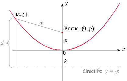 The distance d from any point (x, y) to the focus (0,p) is the same as the distance from (x, y) to the directrix.