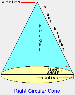 圆锥体积 = (π o r^2 o h) / 3 侧面积= (π o r o slant height)